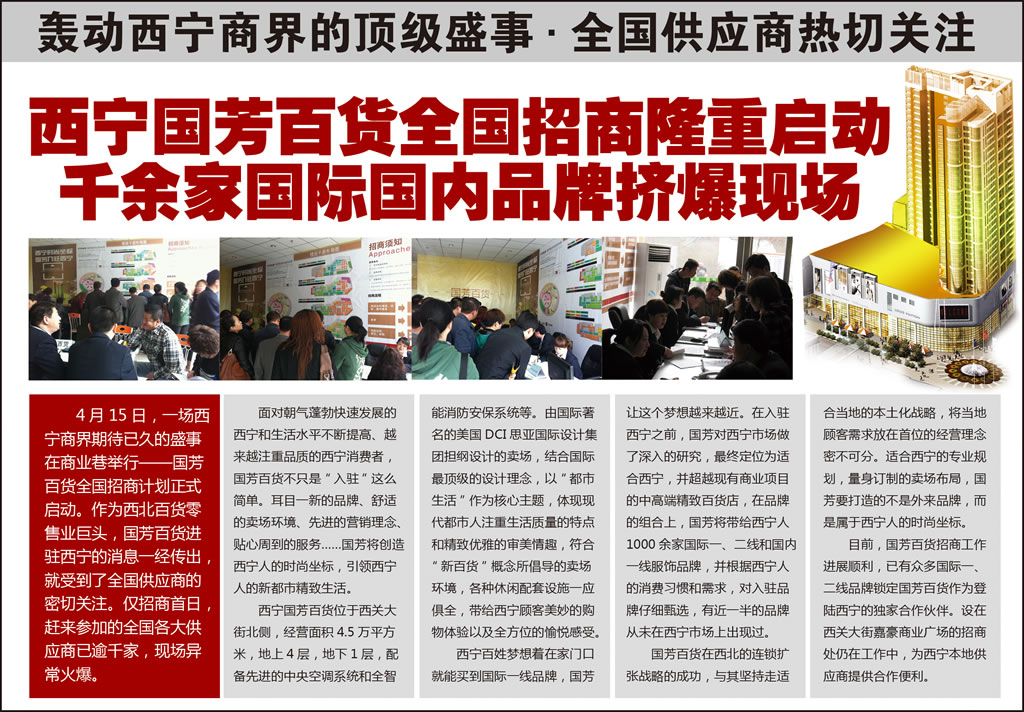 4月15日,一场西宁商界期待已久的盛事在商业巷举行——国芳百货全国招商计划正式启动。作为西北百货零售业巨头,国芳百货进驻西宁的消息一经传出,就受到了全国供应商的密切关注。仅招商首日,赶来参加的全国各大供应商已逾千家,现场异常火爆。