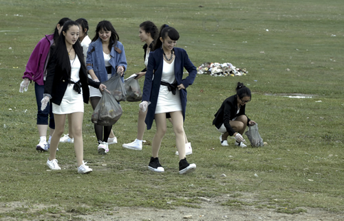 中午,一行到达青海湖畔。天高地阔的美景与靓丽的美女即刻构筑成为一道精彩的风景,随行摄影师、摄像师即刻拿起机器留下许多难得的好画面。接下来的环保实践与环保意识推广为众多选手留下了深刻的印象,许多选手纷纷表示希望通过自己的行动提高社会环保意识,让跟多人参与到保护青海湖环境中来。