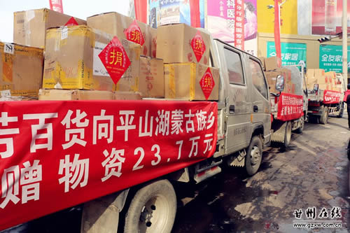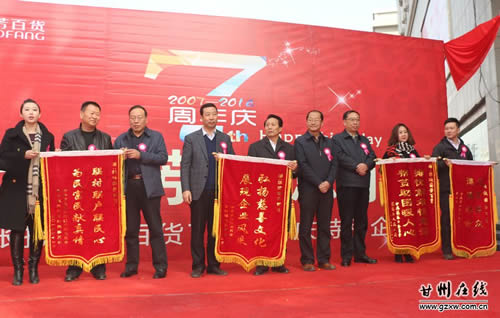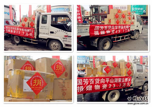 11月22日上午,张掖国芳百货公司7周年庆典之际,为我区甘浚镇光明村、花寨乡柏杨树村和平山湖乡困难群众一次性捐赠了价值71万元的物资。区委常委、常务副区长秦伟、副区长张兴锋出席了捐赠仪式。