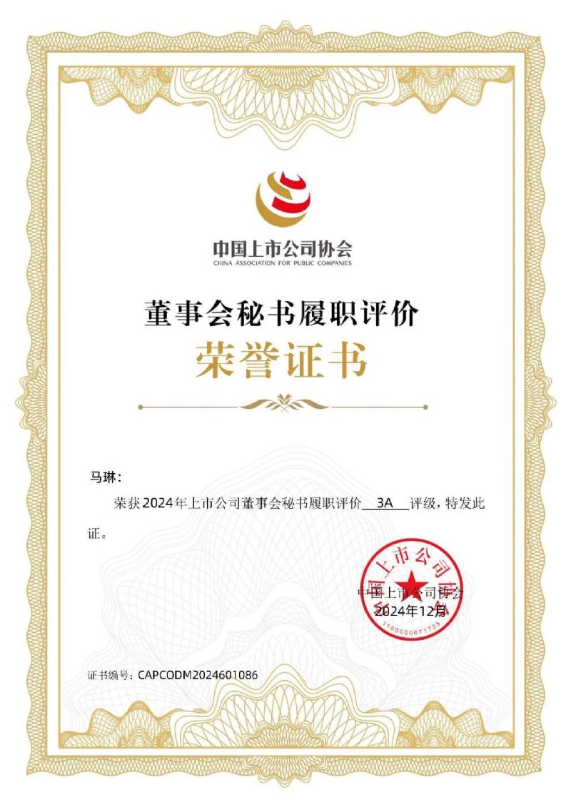 中上协发布丨公司荣获“2024上市公司董事会秘书履职评价”3A评级